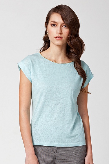 Футболка изготовлена из 100% ЛЬНЯНОГО трикотажного полотна. Натуральный состав обеспечивает комфорт при носке. Свободный объем вверху и плотное прилегание по низу создают модный образ. Украшением футболки является декоративная золотая цепочка, которая нашита на горловину.