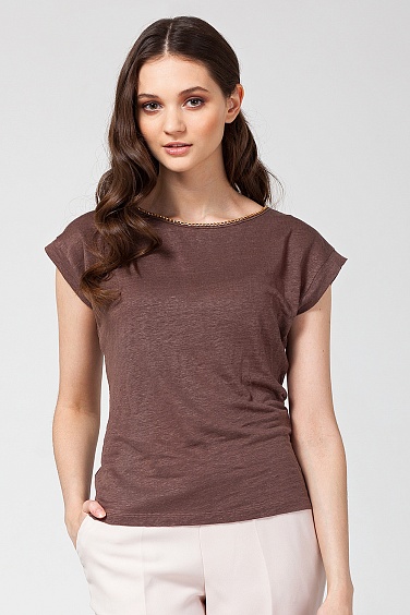 Футболка изготовлена из 100% ЛЬНЯНОГО трикотажного полотна. Натуральный состав обеспечивает комфорт и долговечность при носке. Свободный объем вверху и плотное прилегание по низу создают модный образ. Украшением футболки является декоративная золотая цепочка, которая нашита на горловину.
