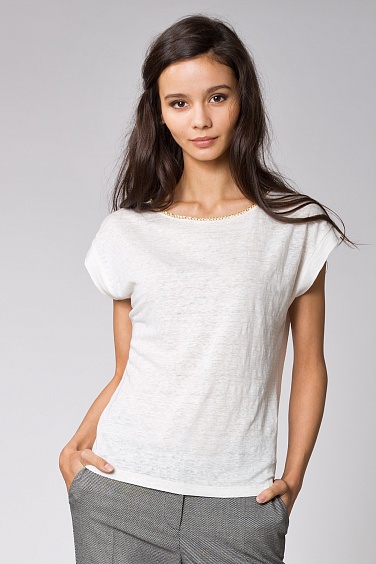 Футболка изготовлена из 100% ЛЬНЯНОГО трикотажного полотна. Натуральный состав обеспечивает комфорт при носке. Свободный объем вверху и плотное прилегание по низу создают модный образ. Украшением футболки является декоративная золотая цепочка, которая нашита на горловину.