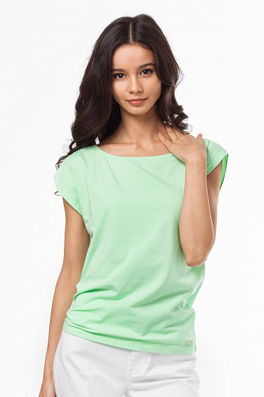 Футболка выполнена из эластичного хлопкового трикотажного полотна. Спущенное плечо. Горловина обработана обтачкой.