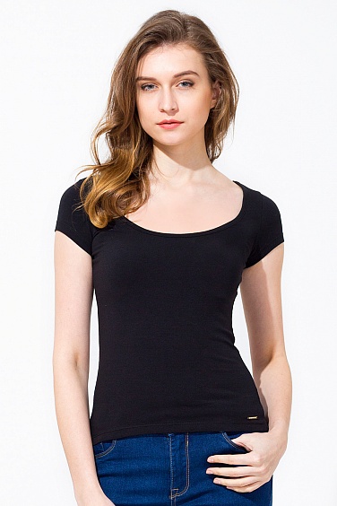 Эластичная хлопковая футболка с посадкой по фигуре и глубоким вырезом горловины. Низ изделия украшен золотистым логотипом.