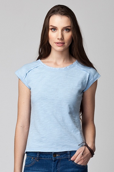 Футболка женская из трикотажного фактурного хлопкового полотна с декоративными швами на плечах, которые, как и горловина, украшены хлопковым кружевом в тон футболки. Спущенное плечо, объемный верх хорошо сочетается с узким низом. Внизу пришит маленький золотистый логотип.