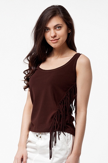 Топ выполнен из мягкого хлопкового трикотажного полотна с добавлением эластана для лучшей формоустойчивости. Горловина и проймы обработаны обтачкой с декоративными отстрочками. Спинка длиннее переда. В левом боку в рельефе вставлена бахрома - закручивающиеся полоски трикотажа.