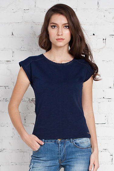 Футболка женская из трикотажного фактурного хлопкового полотна с декоративными швами на плечах, которые, как и горловина, украшены кружевом в тон футболки. Спущенное плечо, объемный верх хорошо сочетается с узким низом. Внизу пришит маленький золотистый логотип.