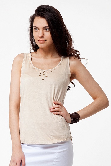 Спинка выполнена из тонкого вискозного трикотажа, перед из мягкого трикотажного полотна с имитацией под иск.замшу, перед украшен композицией цвета состаренного золота.