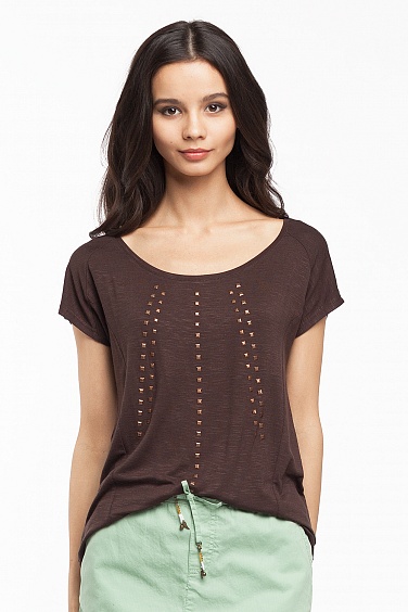Топ выполнен из тонкого трикотажного полотна, изготовленного из нитей разной толщины, за счет чего образуется оригинальная структура полотна. Горловина обработана обтачкой. Спереди термо декорация в виде металлических квадратиков, расположенных рядами.