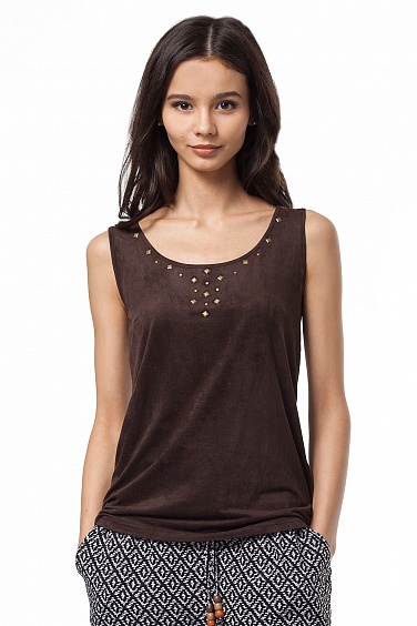 Спинка выполнена из тонкого вискозного трикотажа, перед из мягкого трикотажного полотна с имитацией под иск.замшу, перед украшен композицией цвета состаренного золота.