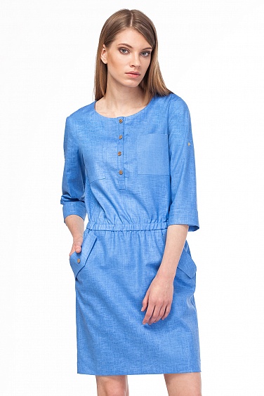 Платье из льняной ткани, обработанной специальной пропиткой , которая придает эффект блеска и предотвращает сильную сминаемость. Прямой силуэт с резинкой в талии. На груди накладные карманы, на юбке наклонные карманы с клапанами, которые закреплены отделочной кнопкой. Застежка на планку с четырьмя плоскими золотыми кнопками-таблетками. Рукав 3\4 с манжетой, с хлястиком , который позволяет фиксировать подвернутый рукав. На спинке фигурная кокетка.