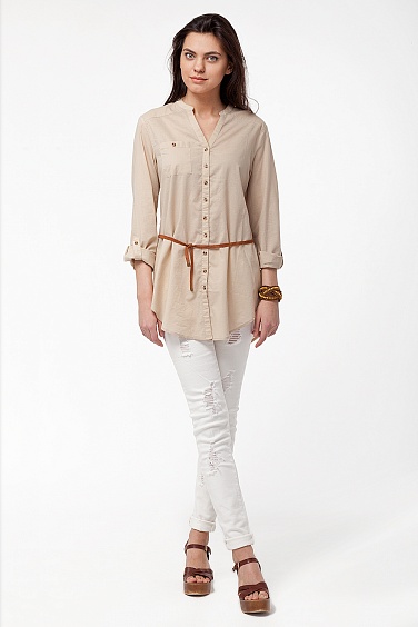 Блузка выполнена из тонкого хлопчатобумажного полотна. Кокетка полочки и спинки двуслойная. Накладной карман на груди застегивается на пуговицу. Пуговицы пластиковые, бежево-коричневого цвета. Рукав с манжетой. Длина рукава регулируется патой на пуговице. Заниженная талия обозначена шлевками, в которые вставлен плетёный верёвочный пояс. На конце пояса железные плоские наконечники.
