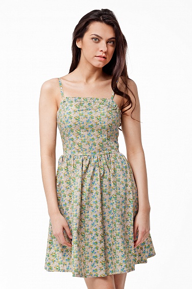 Платье выполнено из плотной хлопчатобумажной ткани. Верх лифа и средняя часть спинки на резинке, для лучшего прилегания. Застежка в боковом шве на молнию. Длина с каждым размером увеличивается на 3 см и в 48 размере длина немного выше колена.