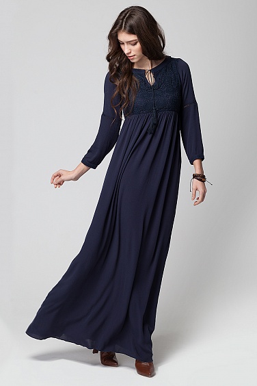 Платье из штапельной вискозной ткани с отделкой кружевом на лифе. Круглый ворот с вырезом капля, завязывается на крученые веревочки с кисточками на концах. На рукавах выше кружевные вставки вышивки - мережка. По талии резинка. Рукава 3/4 с манжеткой на пуговице. Платье на хлопковой подкладке.