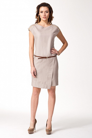 Платье изготовлено из плотной ткани - лен с хлопком. На плечах двойная кокетка с золотистой металлической молнией. Спереди на юбке дополнительная удлиненная деталь, имитирующая запах с ручной отделочной строчкой по широкой обтачке. Сзади средний шов и выточки на талии для лучшей посадки на фигуре. Молния в среднем заднем шве окантована внутри основным материалом. С каждым размером длина платья увеличивается на 3 см. В больших размерах длина доходит до середины колена.