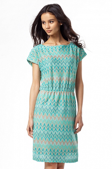 Платье выполнено из ажурного трикотажа с небольшим вкраплением люрекса. Платье на подкладке. Спущенное плечо, талия на резинке. В больших размерах длина платья увеличивается и закрывает колено.