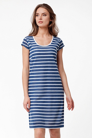 Платье выполнено из синтетического трикотажа на ощупь похожего на хлопковый. Короткий втачной рукав. Горловина обработана контрастной окантовкой. Платье на трикотажной вискозной подкладке.
