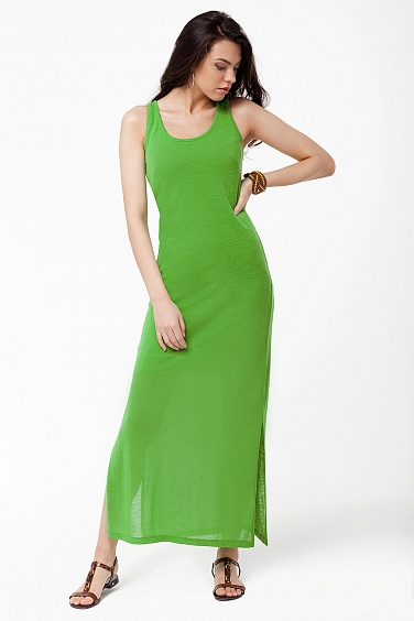 Сарафан изготовлен из мягкого трикотажного полотна. Горловина и проймы обработаны кантом. Обтачка горловины на спинке переходит в две длинные завязки. Платье на вискозной трикотажной подкладке, длиной до колена.