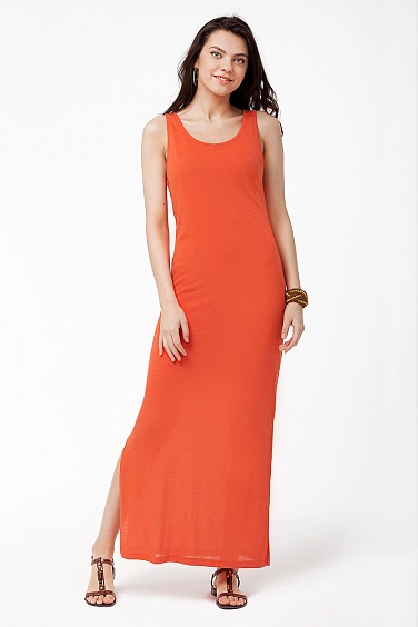 Сарафан изготовлен из мягкого трикотажного полотна. Горловина и проймы обработаны кантом. Обтачка горловины на спинке переходит в две длинные завязки. Платье на вискозной трикотажной подкладке, длиной до колена.