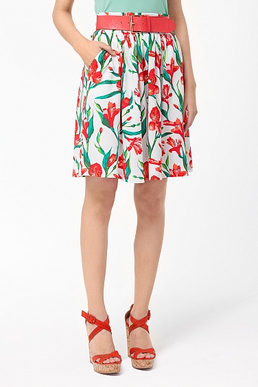 Юбка выполнена из штапельного вискозного полотна. Пояс широкий прямой, располагается на талии. Сзади застежка на золотистую молнию и внутреннюю пуговицу. По бокам шлевки для пояса. Широкий пояс из искусственной кожи входит в стоимость изделия. В 48-52 размерах длина юбки до колена.