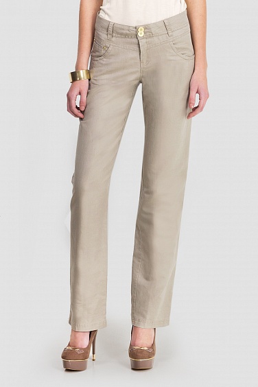 Брюки выполнены из плотной натуральной ткани - лен с хлопком. Спереди и сзади фигурная кокетка с двойной отделочной строчкой. Спереди "джинсовые" карманы, с декоративно отстроченными выточками. Сзади прорезные карманы в рамку, мешковина закреплена фигурной отделочной строчкой. Спереди на поясе 2 золотистые пуговицы.