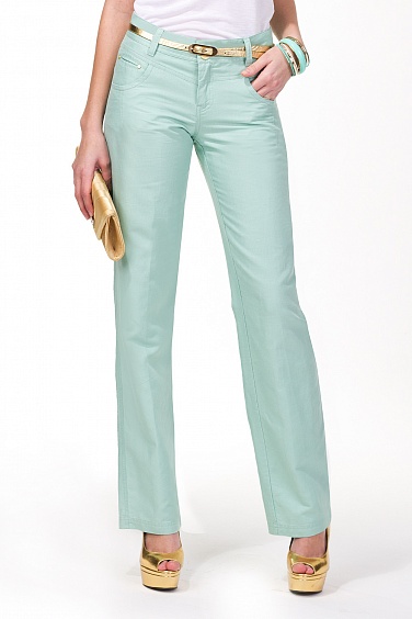 Брюки выполнены из плотной натуральной ткани - лен с хлопком. Спереди и сзади фигурная кокетка с двойной отделочной строчкой. Спереди "джинсовые" карманы, с декоративно отстроченными выточками. Сзади прорезные карманы в рамку, мешковина закреплена фигурной отделочной строчкой. Спереди на поясе 2 золотистые пуговицы.