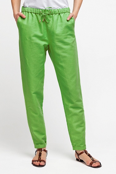 Брюки выполнены из плотной хлопково-льняной ткани саржевого переплетения. Притачной пояс с кулиской и резинкой внутри. Люверсы кулиски и наконечники тонкого пояса металлические, золотистого цвета. Боковые карманы с отрезными бочками - спереди. Сзади - карманы прорезные с листочкой. Штанины брюк заканчиваются отложной притачной манжетой, закрепленной к боковым швам.