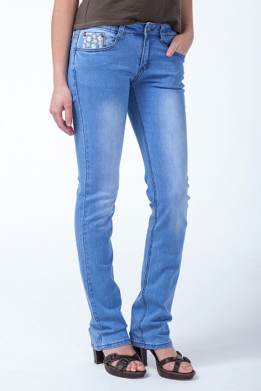 Джинсы изготовлены из плотной эластичной джинсовой ткани. Край переднего кармана в боковом шве штанин усилен заклёпкой. Маленький кармашек с правой стороны декорирован кружевом с цветочками.