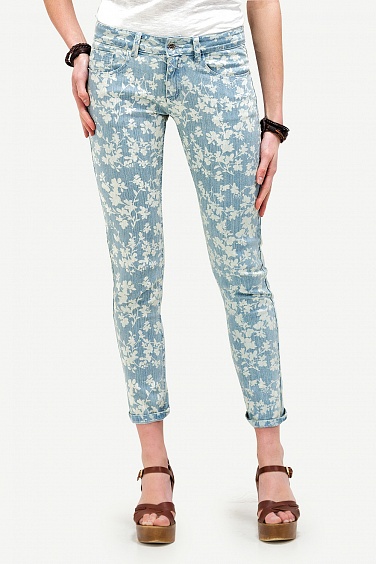 Джинсы изготовлены из плотной эластичной джинсовой ткани с вытравленным цветочным рисунком.