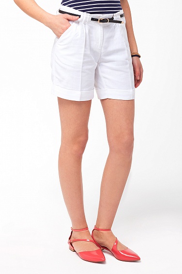 Удлиненные шорты классического кроя с манжетами внизу, защипами спереди и стрелками. В стоимость изделия входит ремень. Сзади карман-рамка.