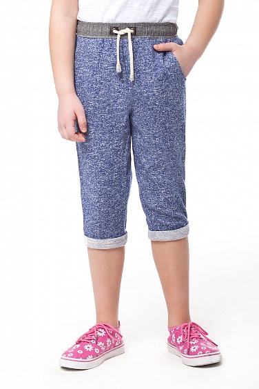 Капри для девочки из мягкого футера. Контрастная отстрочка вдоль боковых карманов. Пояс из отделочной ткани. Декоративные кожаные детали служат украшением и уплотнителем для люверсов.