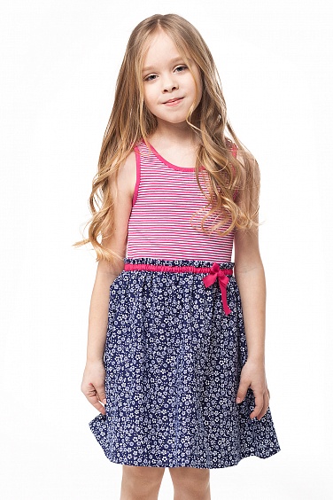 Платье для девочки, отрезное по линии талии, декорировано яркой тесьмой и бантом . Лиф платья выполнен из трикотажного полотна, юбка из хлопчатобумажной ткани с принтованным рисунком. Талии на резинке.