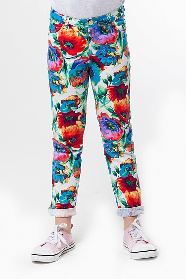 Брюки для девочки из эластичной ткани с накладными карманами. Внутренний пояс из отделочного материала. Внутренняя окантовка бокового шва позволяет отворачивать низ и регулировать длину. Ширина талии регулируется внутренней резинкой и пуговицей.