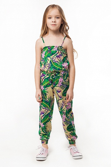 Комбинезон для девочки умеренного объема и хлопкового полотна. На талии собирается на резинку. Верхняя часть лифа и манжеты брючин собраны параллельными эластичными строчками. Длина бретелей регулируется.