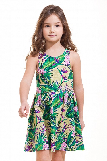 Трикотажное платье из хлопкового принтованного полотна. Талия собрана на узкую резинку. За счет оригинального кроя, на спинке модели фигурный вырез в виде треугольника. Для хорошего прилегания верхняя часть спинки собрана на резинку.