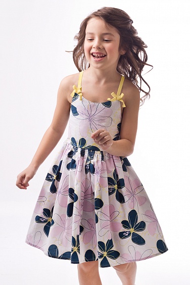 Платье из принтованного хлопкового полотна. Спинка собрана параллельными эластичными строчками, что обеспечивает идеальную посадку. Бретели регулируются по длине.