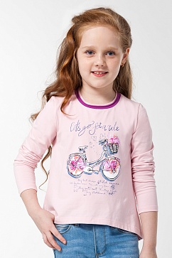 Футболка из хлопкового трикотажа с удлиненной спинкой и горловиной контрастного цвета с открытым срезом. Перед декорирован принтом с глиттером.