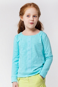 Футболка для девочки выполнена из тонкого хлопкового фактурного трикотажного полотна. Перед декорирован хлопковым кружевом в тон изделия. По плечам небольшая сборка.
