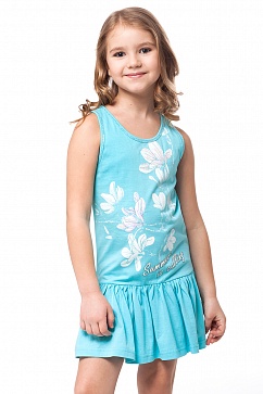 Платье для девочки из хлопкового трикотажа. Декорировано принтом. Горловина и проймы обработаны бейками, отстроченными люрексом.
