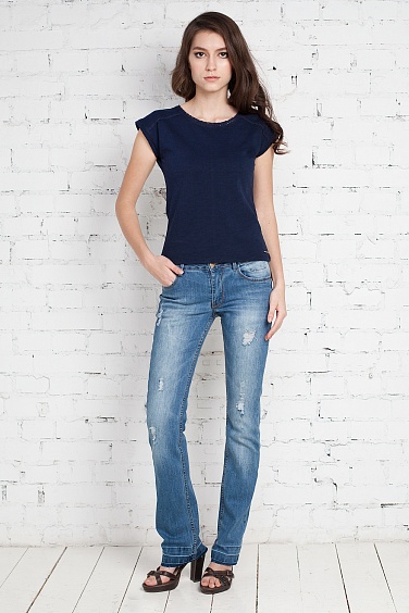 Прямые джинсы на заниженной талии дополнены декоративными повреждениями и актуальной "мраморной" стиркой и потертостями, Особенно эффектно смотрится необработанная подгибка низа, создающая удлиненный силуэт в стиле 70-х.