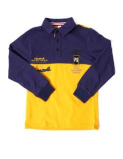 Pinetti DM FM87-D Поло 100%хлопок Поло с длинным рукавом сине - желтого цвета. На передней части выполнены нашивки и принты в виде надписей. На задней части спинки принт "10". Синий / старая цена - 1180 руб. / Новая цена, с учетом скидки - 590 руб. / Размер - 122