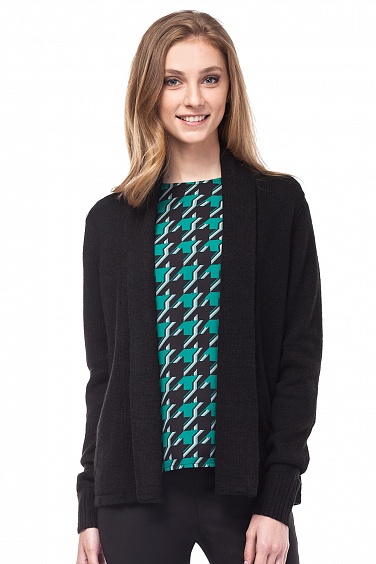 Шерстяной жакет полуприлегающего силуэта без застёжки, имеет отложной воротник и широкие манжеты вывязанные "резинкой"