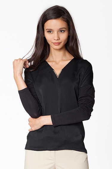 Элегантная блузка с V-образным вырезом, акцентированным золотой фурниурой в виде буквы "V". Передняя часть выполнена из гладкого полуглянцевого полотна, спинка и рукава - трикотажные.