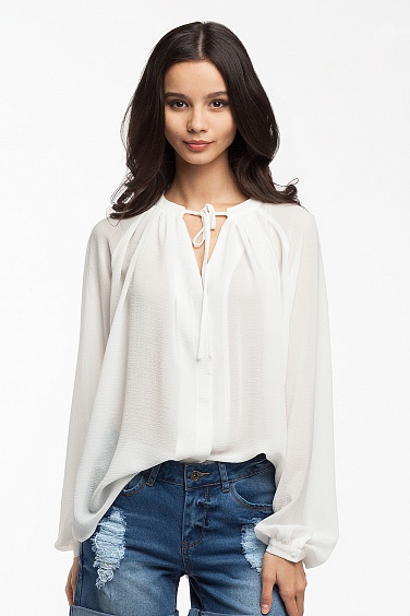 Блузка из фактурного полупрозрачного шифона. Свободный силуэт, сборка вокруг горловины и манжет, множественные мягкие драпировки, завязка на стойке и др. детали создают современный силуэт в стиле 70-х.