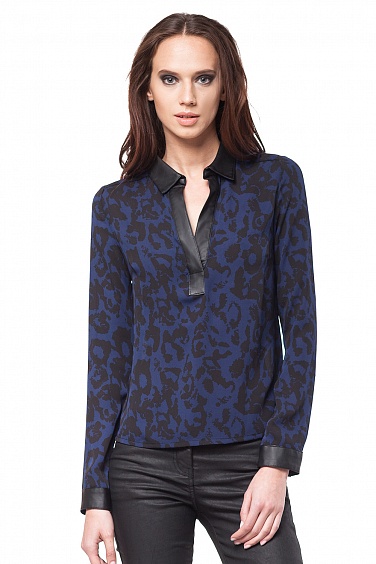 Блузка прямого силуэта из плотного синтетического шелка с принтом. Глубокий v-образным вырезом. Передняя планка, воротник, манжеты выполнены из искусственной кожи.