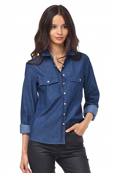 Актуальная джинсовая блузка рубашечного типа - "must have" сезона. Застёжка на пуговицы, отложной воротник на стойке, полочки декорированы большими накладными карманами.