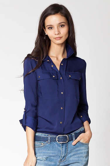 Блузка из плотного полуматового атласа, прямого силуэта. Рукава регулируются при помощи отворота и застежки на пату. На груди два накладных кармана. Застежка на кнопки золотистого цвета с эффектом старения.