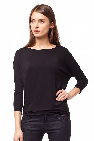 Тонкое вискозное трикотажное полотно. Узкий рукав в спущенной пройме "летучая мышь" длиной 3/4. Свободный силуэт вверху и плотное прилегание на уровне бедер.