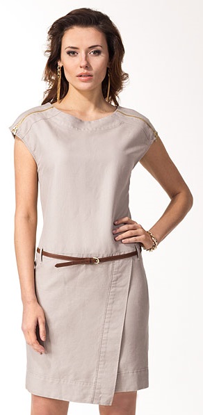 Платье изготовлено из плотной ткани - лен с хлопком. На плечах двойная кокетка с золотистой металлической молнией. Спереди на юбке дополнительная удлиненная деталь, имитирующая запах с ручной отделочной строчкой по широкой обтачке. Сзади средний шов и выточки на талии для лучшей посадки на фигуре. Молния в среднем заднем шве окантована внутри основным материалом. С каждым размером длина платья увеличивается на 3 см. В больших размерах длина доходит до середины колена.