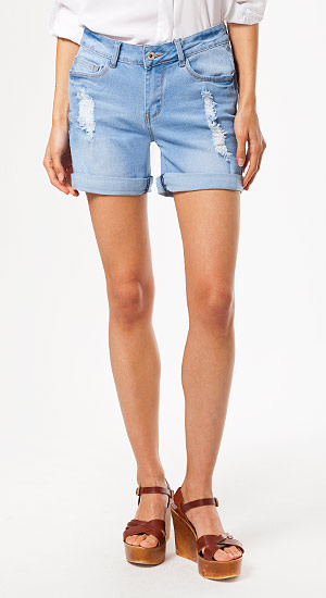 Шорты выполнены из эластичной джинсы с декоративными потертостями и рваным участками спереди. Низ подвернут ввиде манжеты.