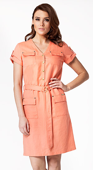 Платье из натуральных волокон льна и хлопка. Полуприлегающий силуэт обеспечивает пояс и резинка на талии. Накладные карманы с клапанами на груди и бедрах. Углы клапанов украшены золотистыми заклепками, на левом кармане лого. Полочки застегиваются на золотистые кнопки. Пояс фиксируется сзади широкой шлевкой, закрепленной заклепкой. По спинке от кокетки - бантовая складка. Рукав с отложной манжетой. Длина рукава регулируется застёжкой на пату.