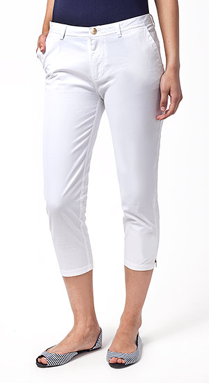 Капри выполнены из плотной эластичной хлопковой ткани. Спереди классические наклонные карманы с широкой отделочной строчкой. Застежка спереди на молнию и пуговицу. Внутренняя часть пояса и мешковины карманов выполнены из тонкой хлопчатобумажной ткани в полоску. Сзади на брюках прорезные карманы с листочкой и отделочная строчка в виде клапана.