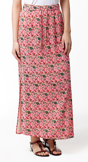 Юбка выполнена из штапельного вискозного полотна. Широкий пояс с кулиской и резинкой. Люверсы кулиски и шарики-наконечники тонкого пояса металлические, золотистого цвета. Юбка прямого силуэта, с разрезами по бокам.